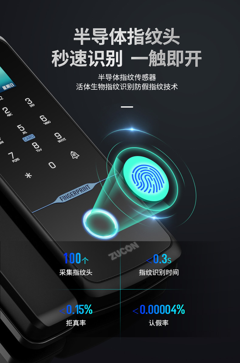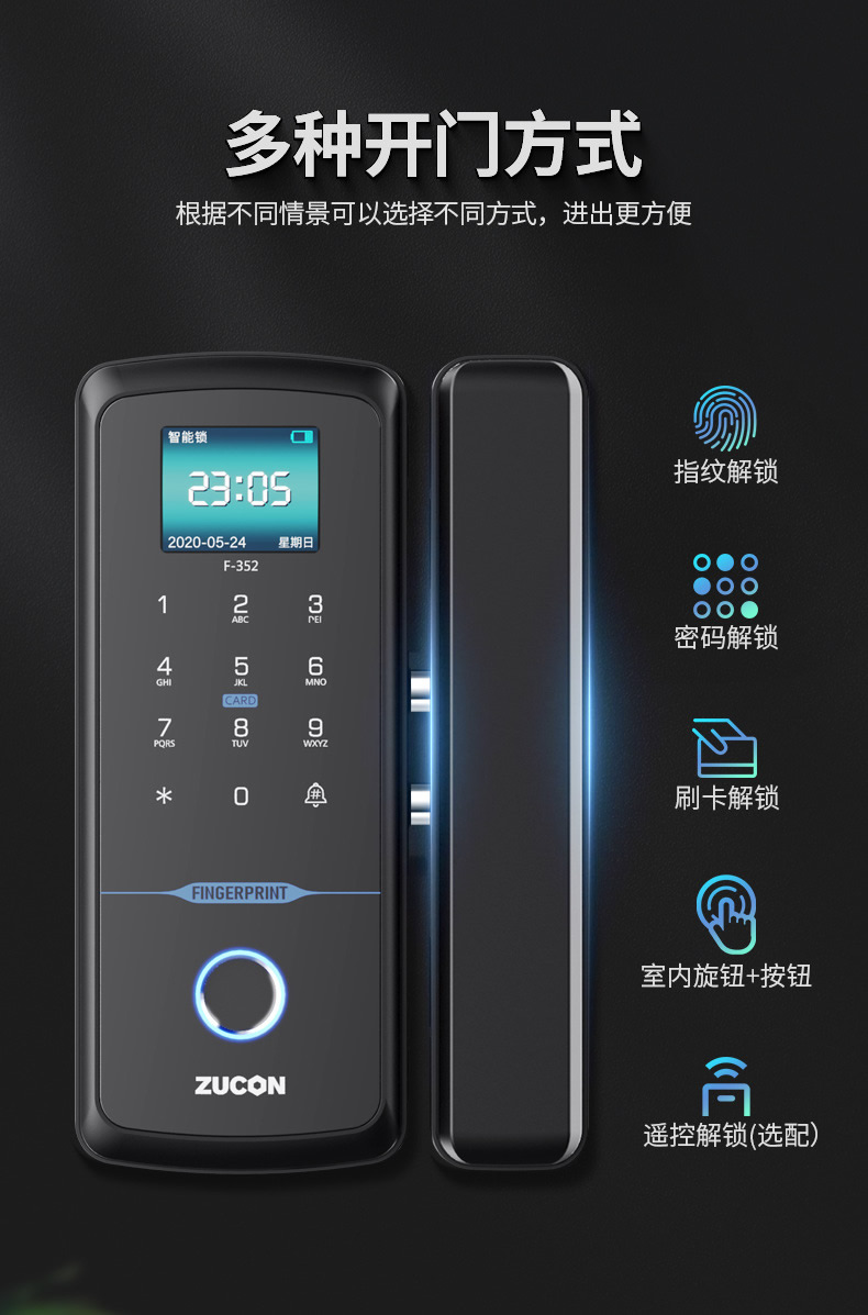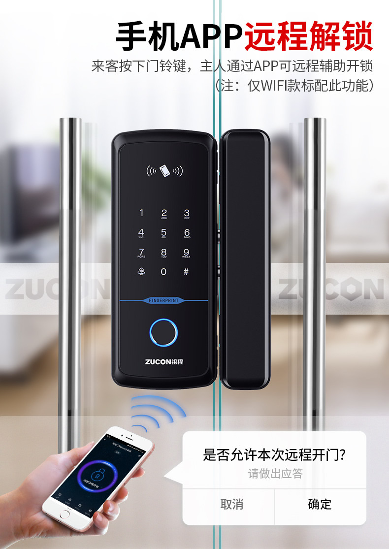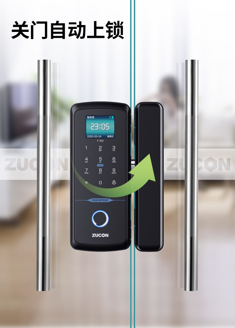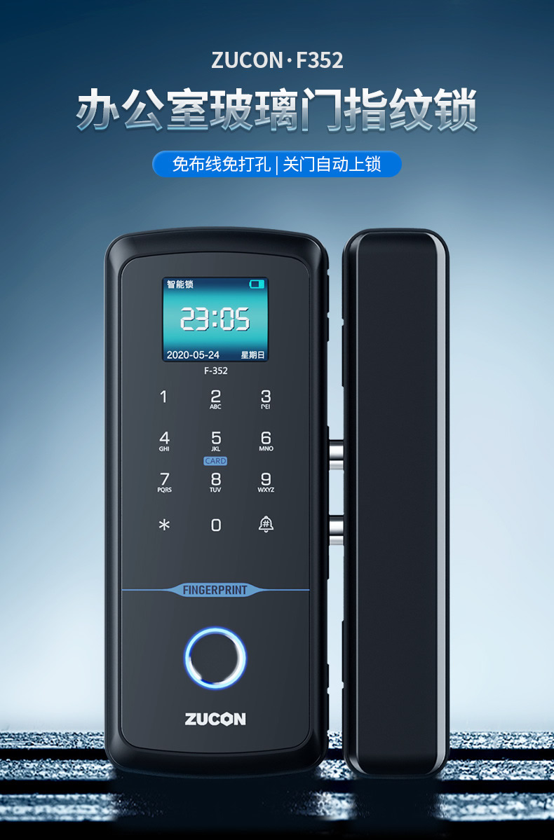 ZUCON祖程F352WIFI玻璃門指紋鎖免開孔辦公室智能電子密碼鎖單雙開門門禁鎖