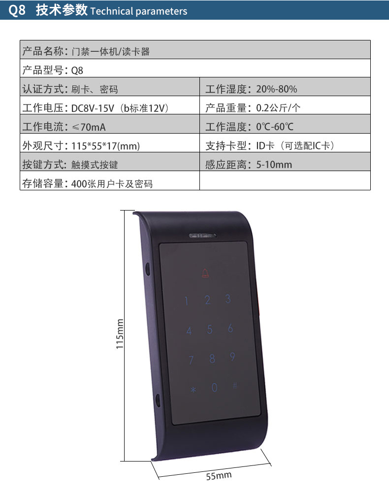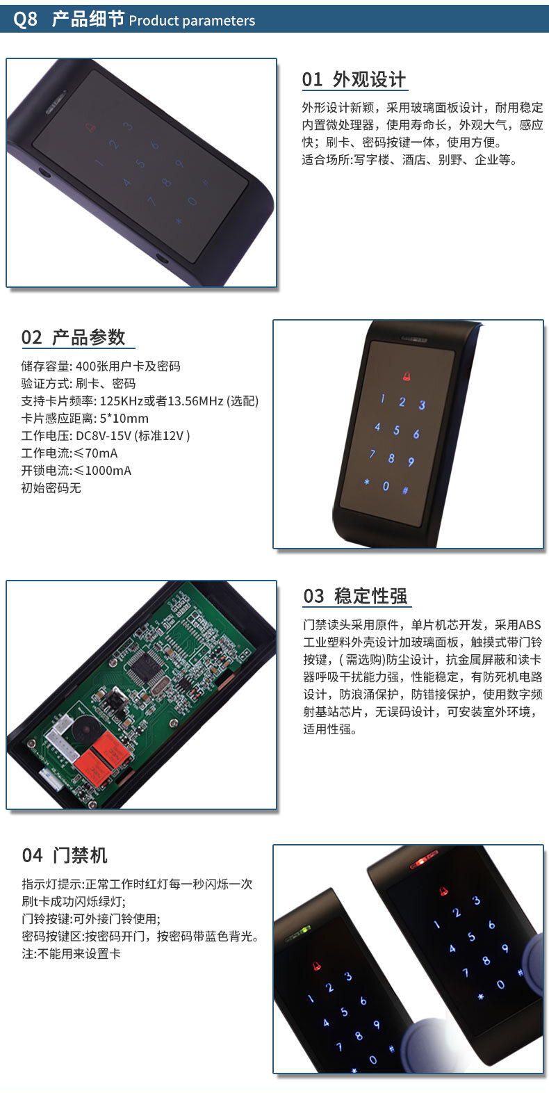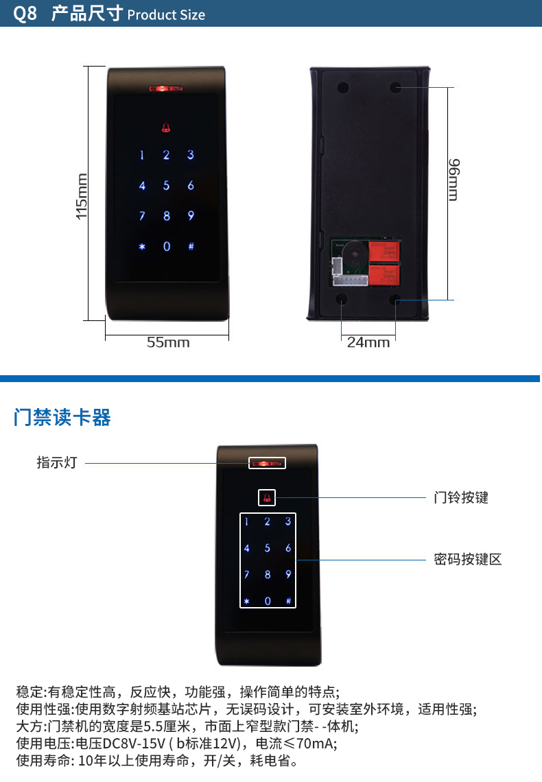 ZUCON祖程Q8、Q8W觸摸按鍵門禁讀卡器門禁讀頭IC ID卡門禁讀頭刷卡機(jī)WG26讀頭