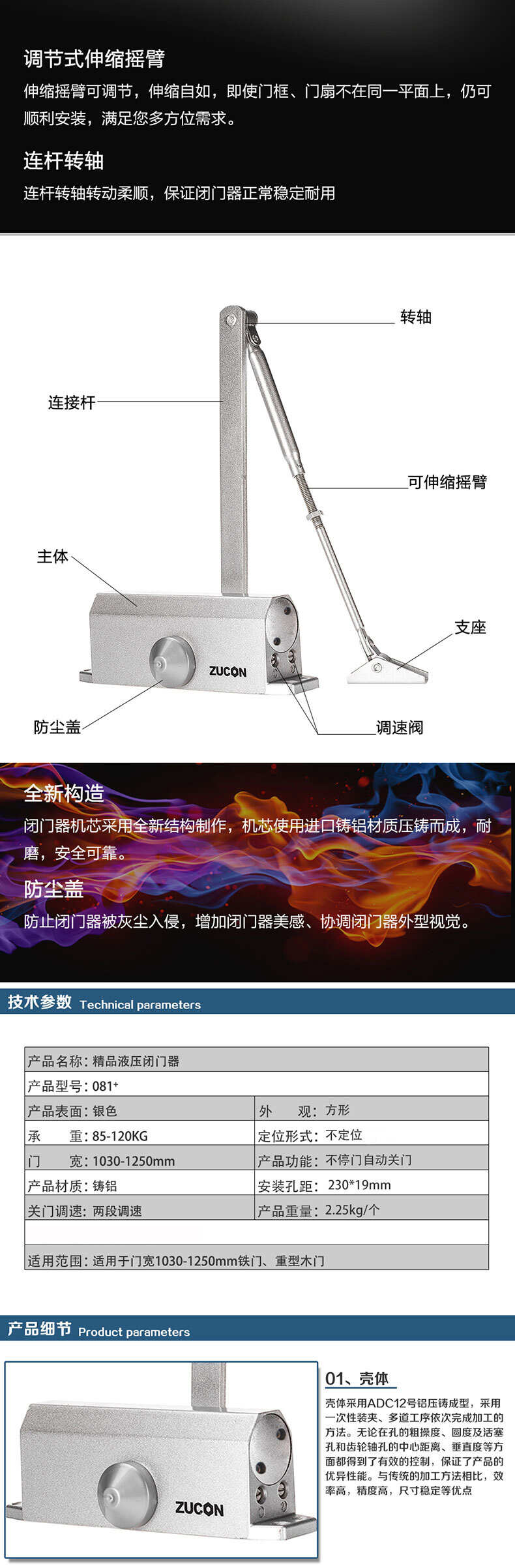 ZUCON祖程081+加大號液壓閉門器 85-120KG自動關(guān)門器不定位閉門器