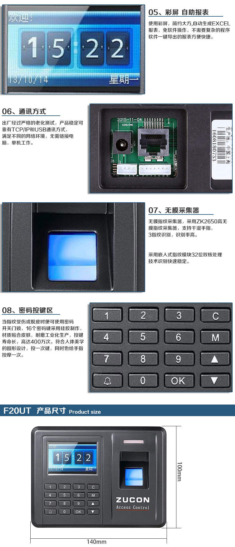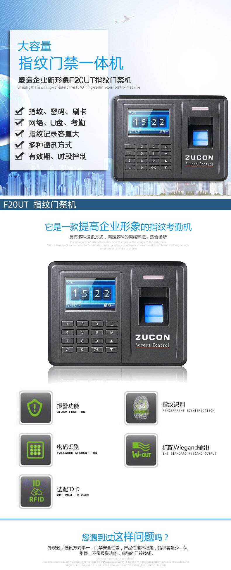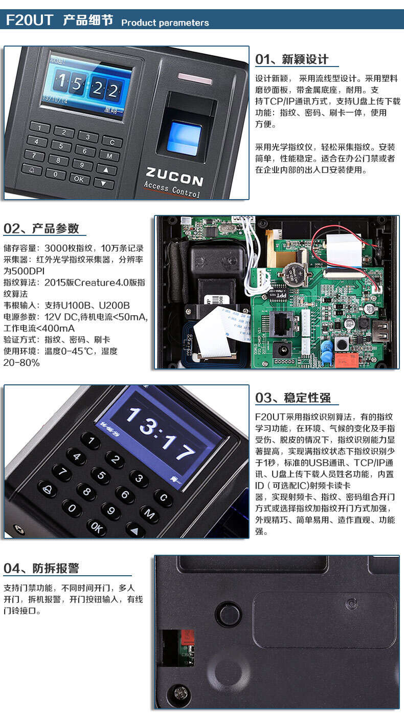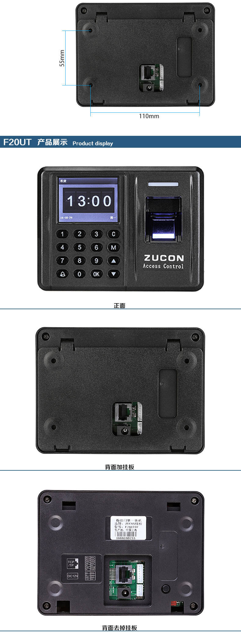 ZUCON祖程F20指紋刷卡密碼門禁考勤主機網(wǎng)絡(luò)U盤下載數(shù)據(jù)3000大容量