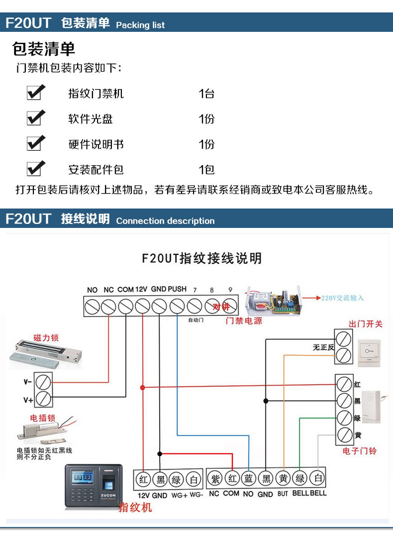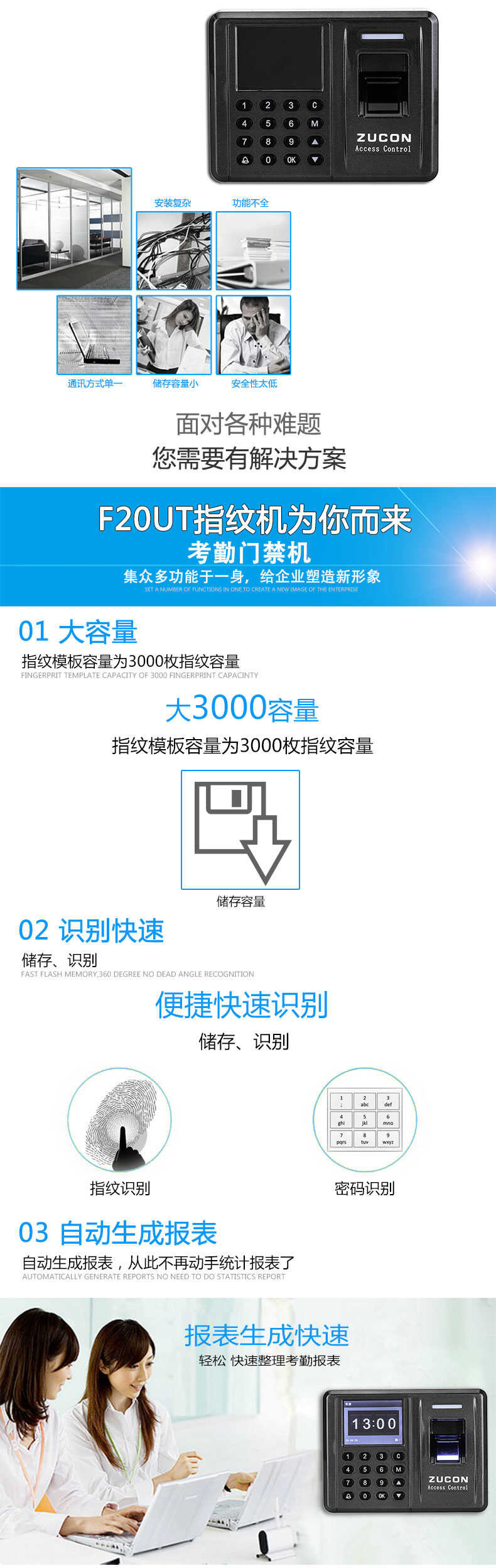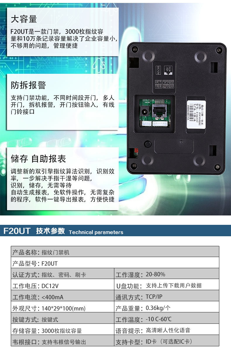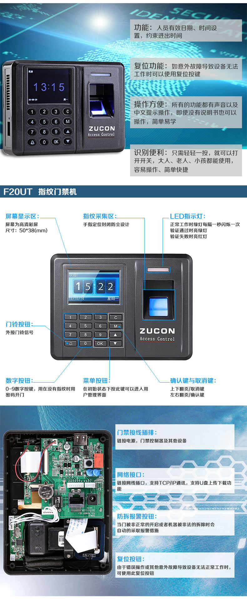 ZUCON祖程F20指紋刷卡密碼門禁考勤主機網(wǎng)絡(luò)U盤下載數(shù)據(jù)3000大容量