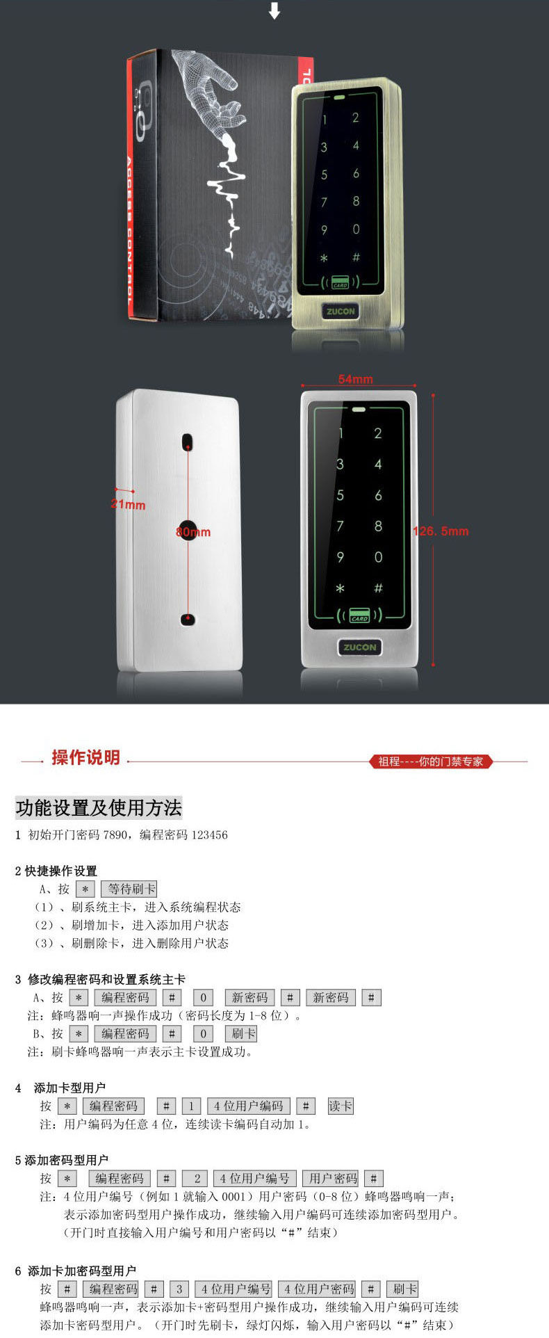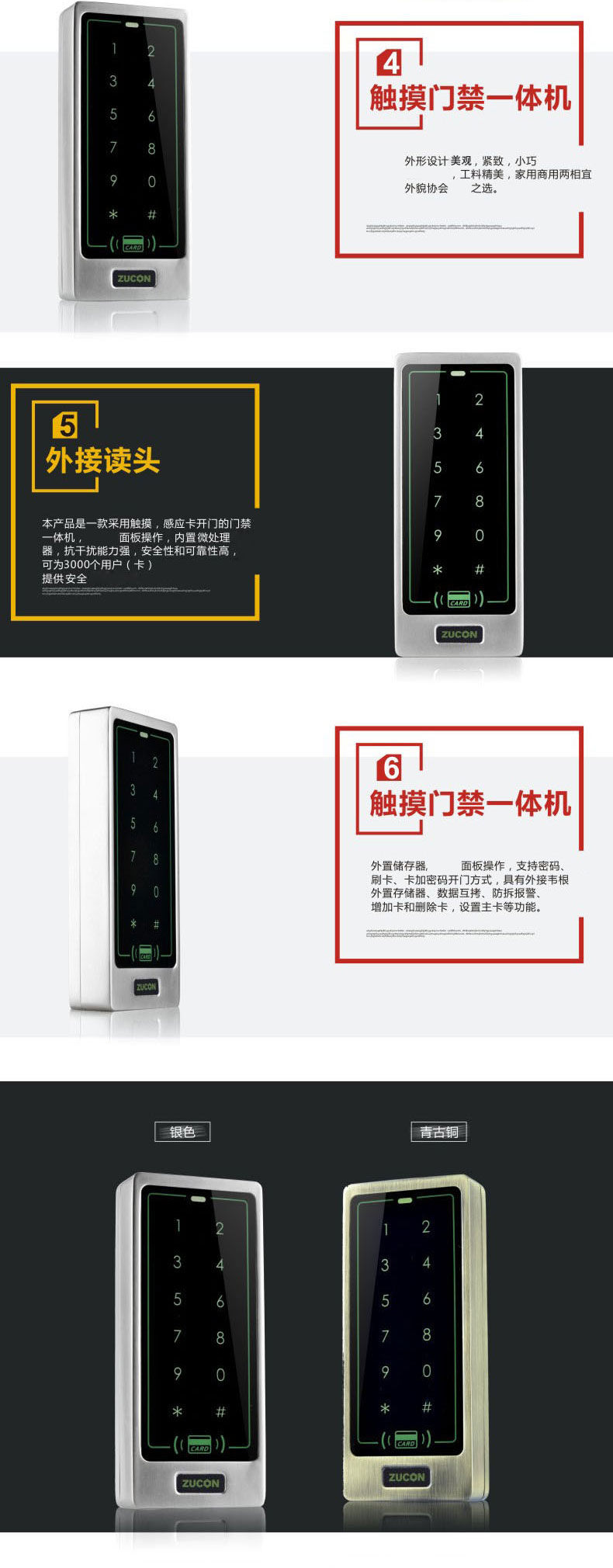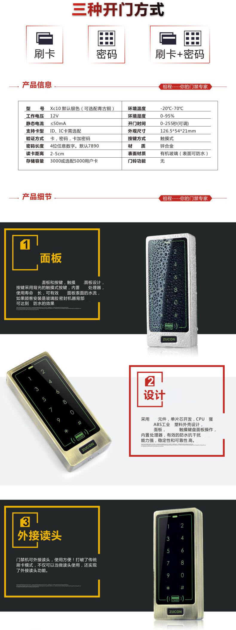 ZUCON祖程XC10金屬門(mén)禁一體機(jī) 防砸不銹鋼室外防水防雨刷卡讀卡器